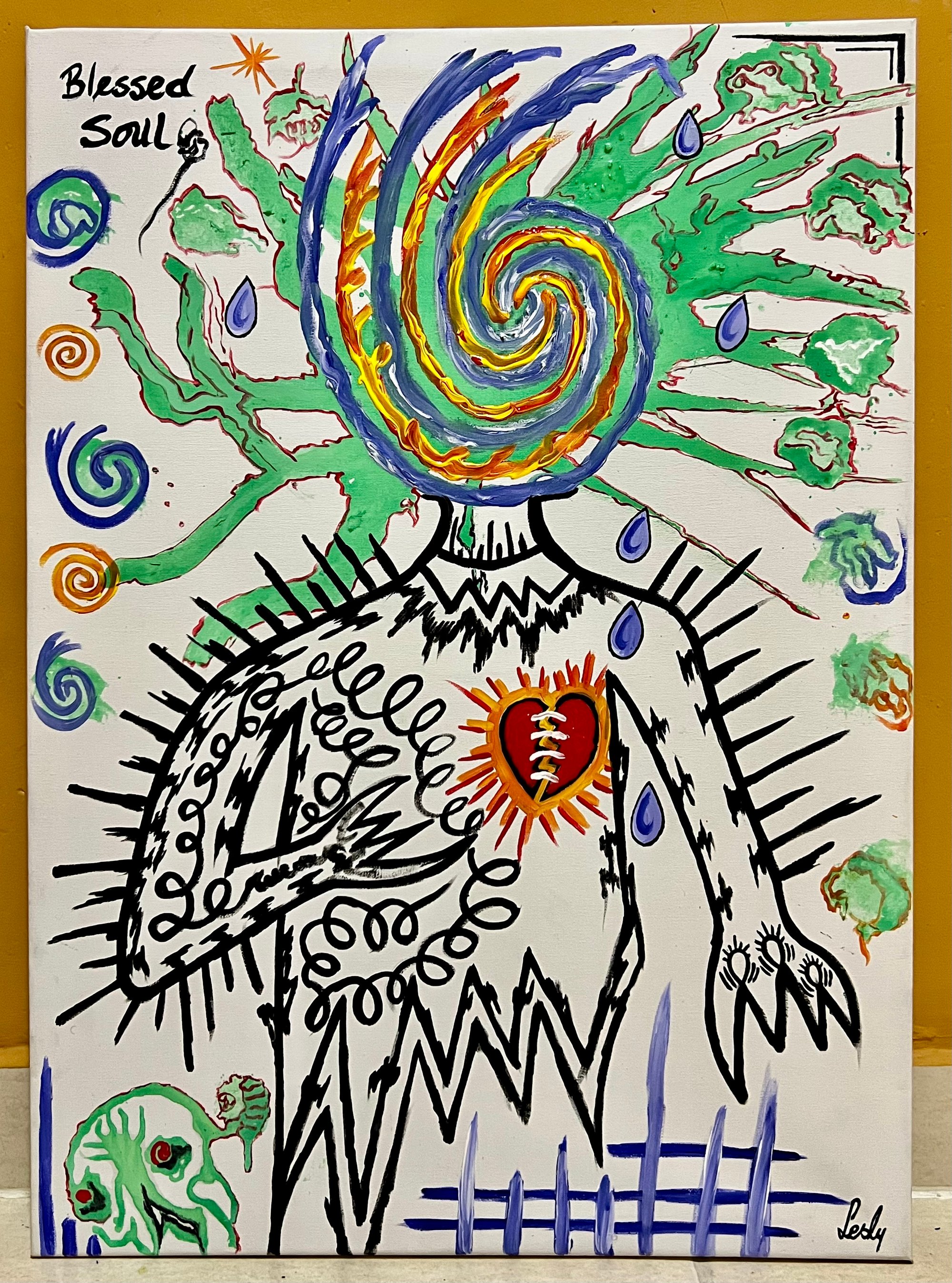 This painting « Blessed Soul” tells the story of a soul who crossed the shadows to reach the light.