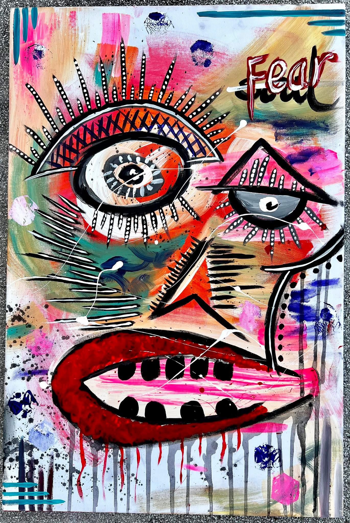 Fear, here, is not hidden it is raw, vulnerable, and alive. But within this intensity, there is also beauty. The bright colors breaking through the darkness remind us that even the heaviest emotions carry energy, movement, and the potential for transformation.