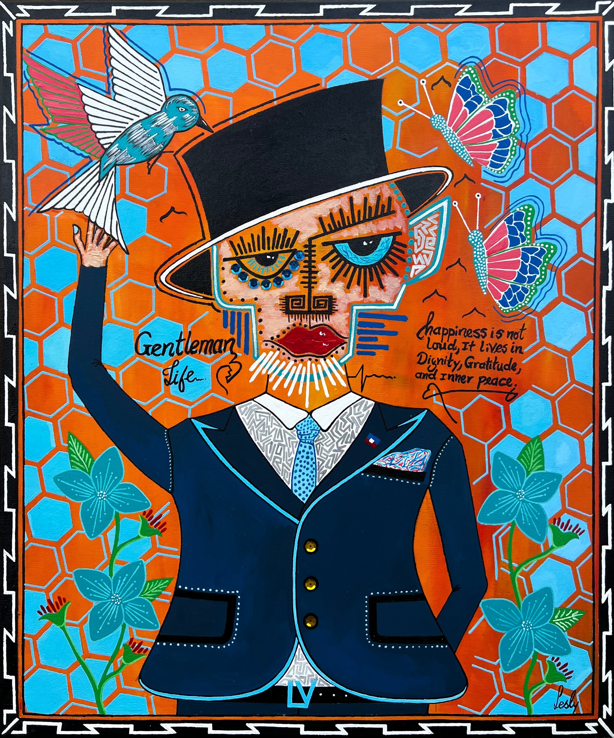 Gentleman Life explores the quiet power of inner balance and self-respect. The central figure stands as a symbol of dignity, emotional intelligence, and spiritual calm in a world often defined by noise and excess. Dressed with elegance yet marked by expressive patterns and symbolic details, the gentleman represents a state of being rather than social status.
