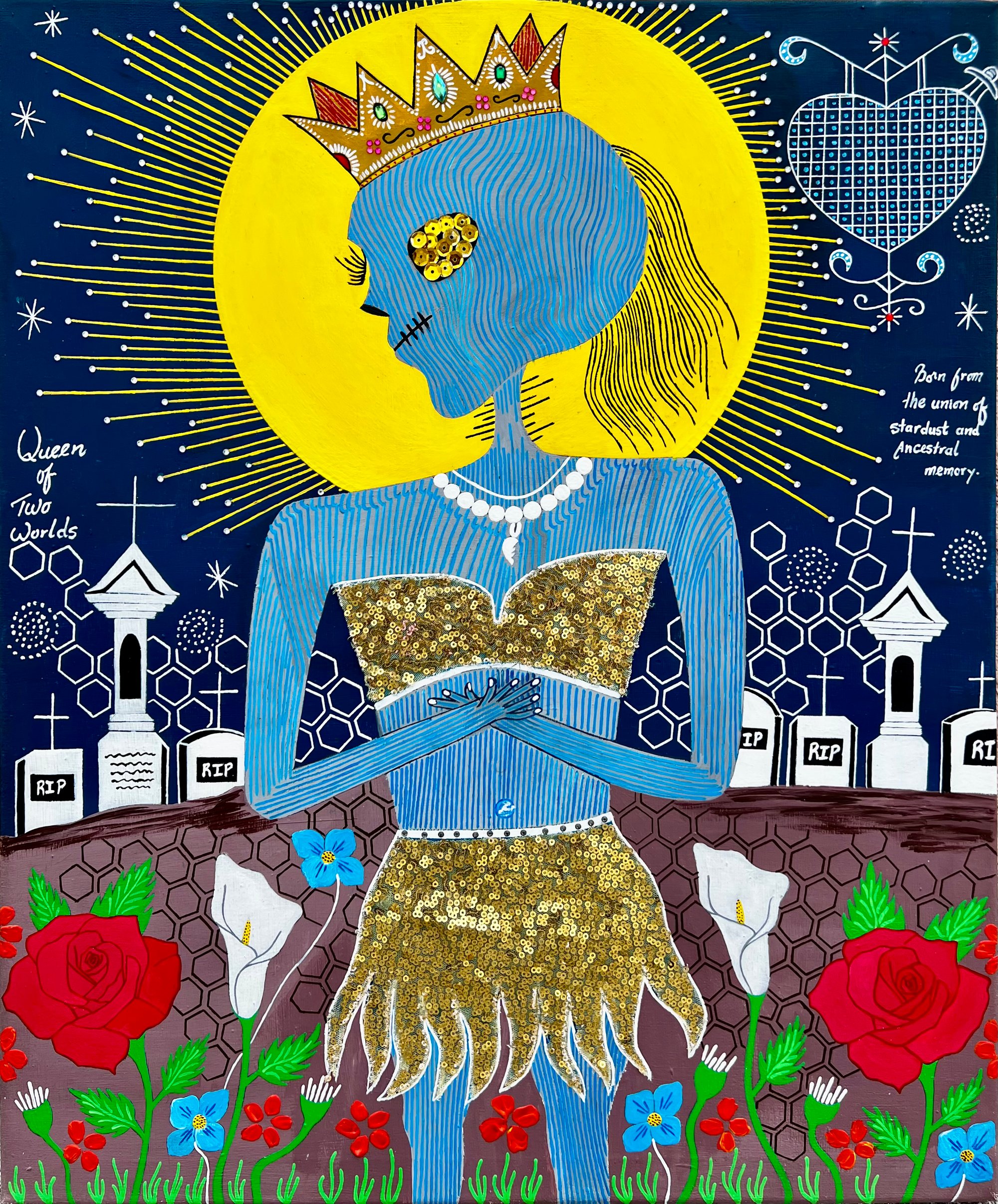 In the space where night touches memory and the stars remember our names. Her presence is radiant, surrounded by a golden halo like the rising sun representing rebirth. She guards the cemetery behind her, a borderland between worlds, where tombstones mark the resting places of forgotten ancestors and loved ones. Yet she isn’t mournful. She’s elegant, clothed in shimmering gold, embodying the dignity of those who have passed and the beauty they leave behind.