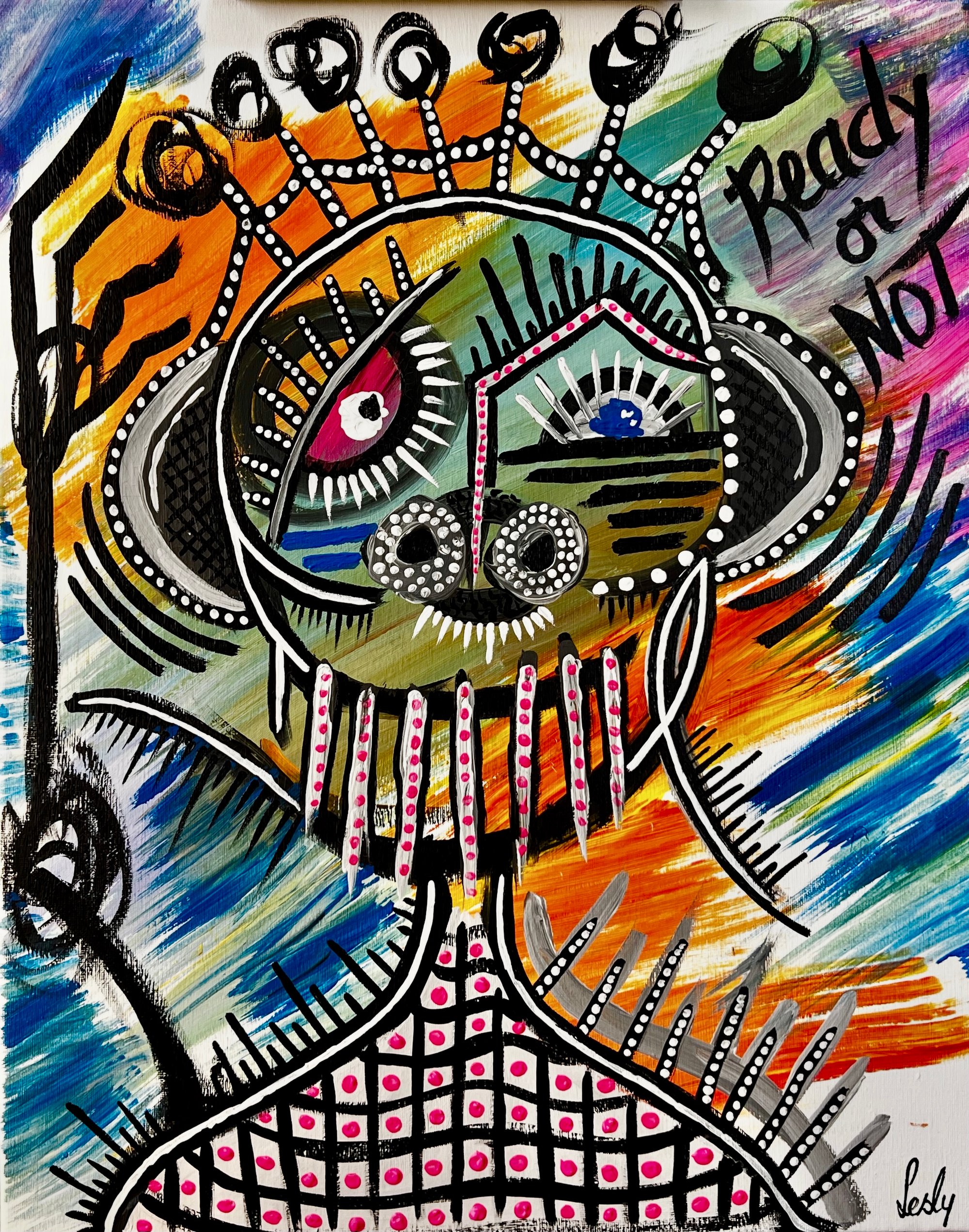 “Ready or Not” is an expressive self-reflection of courage and transformation. The bold strokes and vibrant colors embody the emotional tension between vulnerability and awakening. It invites the viewer to confront their own readiness to face truth, change, and power.