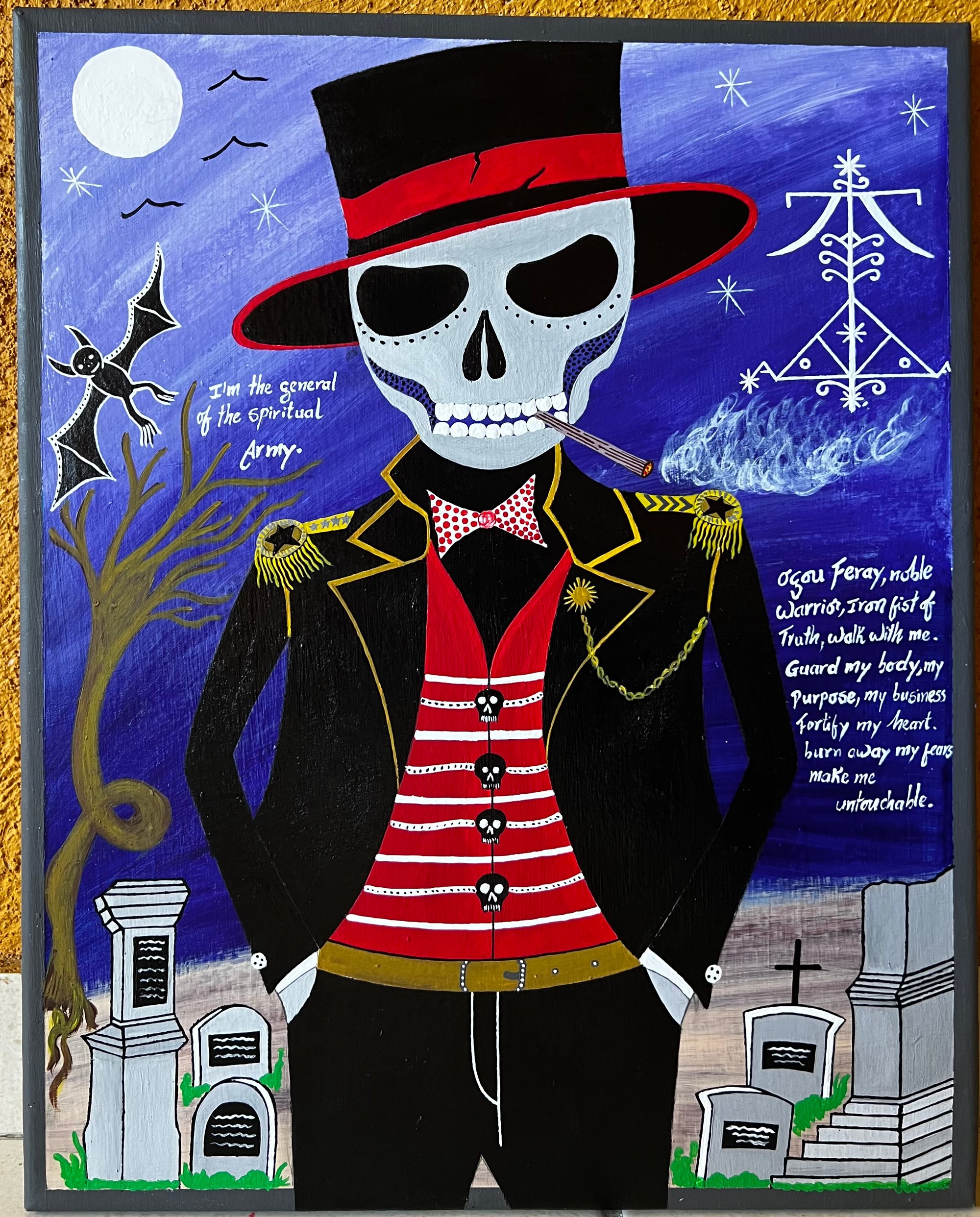 He smokes a ceremonial cigar, its smoke curling like whispers of the ancestors. On his chest, crimson stripes lined with skulls signal his vow: to guard the souls of those who dare to walk with him. At his back, the veve of Ogou Ferray glows like an iron sigil in the night, a symbol of strength and unyielding justice.