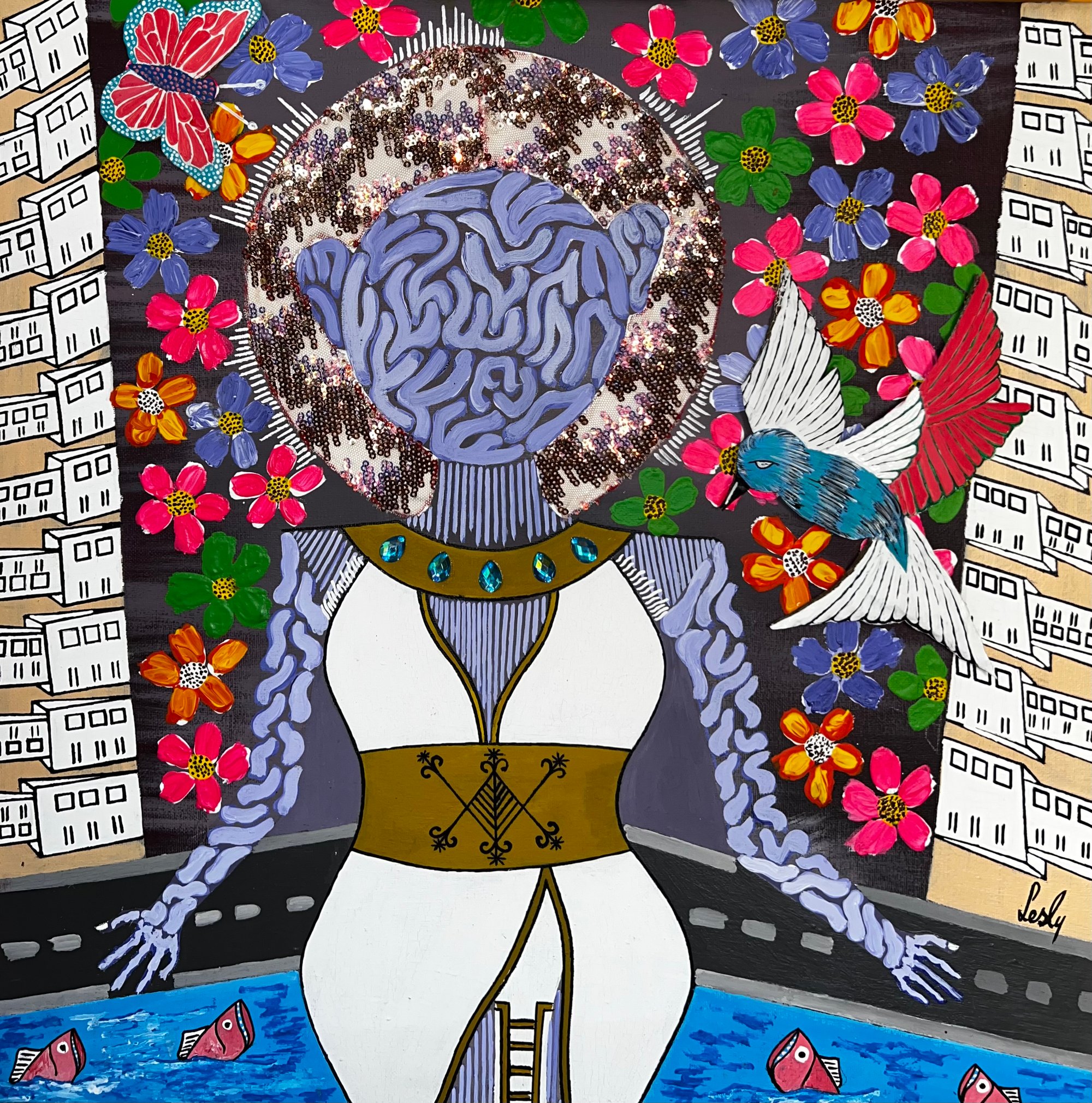 She stands between two worlds: the towering walls of human ambition and the boundless gardens of nature. Flowers bloom at her side, each petal carrying the voices of the market women, healers, and midwives who call upon her. At her feet, waters ripple with sacred fish, messengers between depths and Sky.